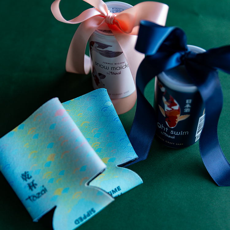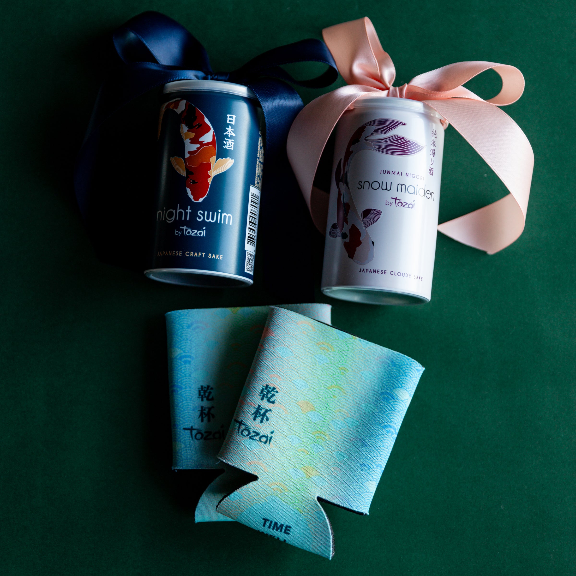 Inside, you'll find five cans each of Tozai's fan-favorite Snow Maiden (creamy nigori) and Night Swim (bright and citrusy), plus two exclusive holiday-themed Tozai koozies to keep your cans cold and your hands warm.